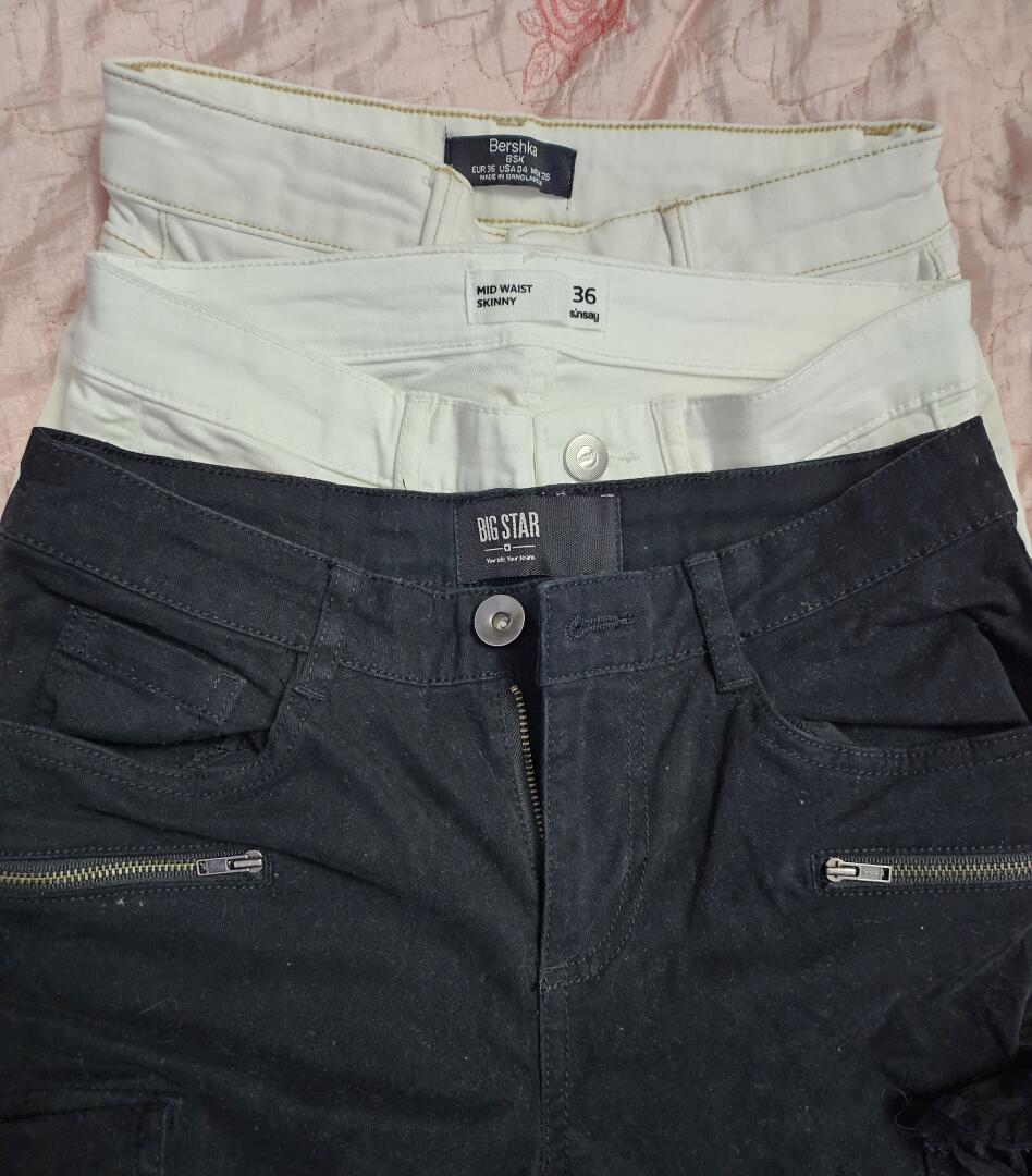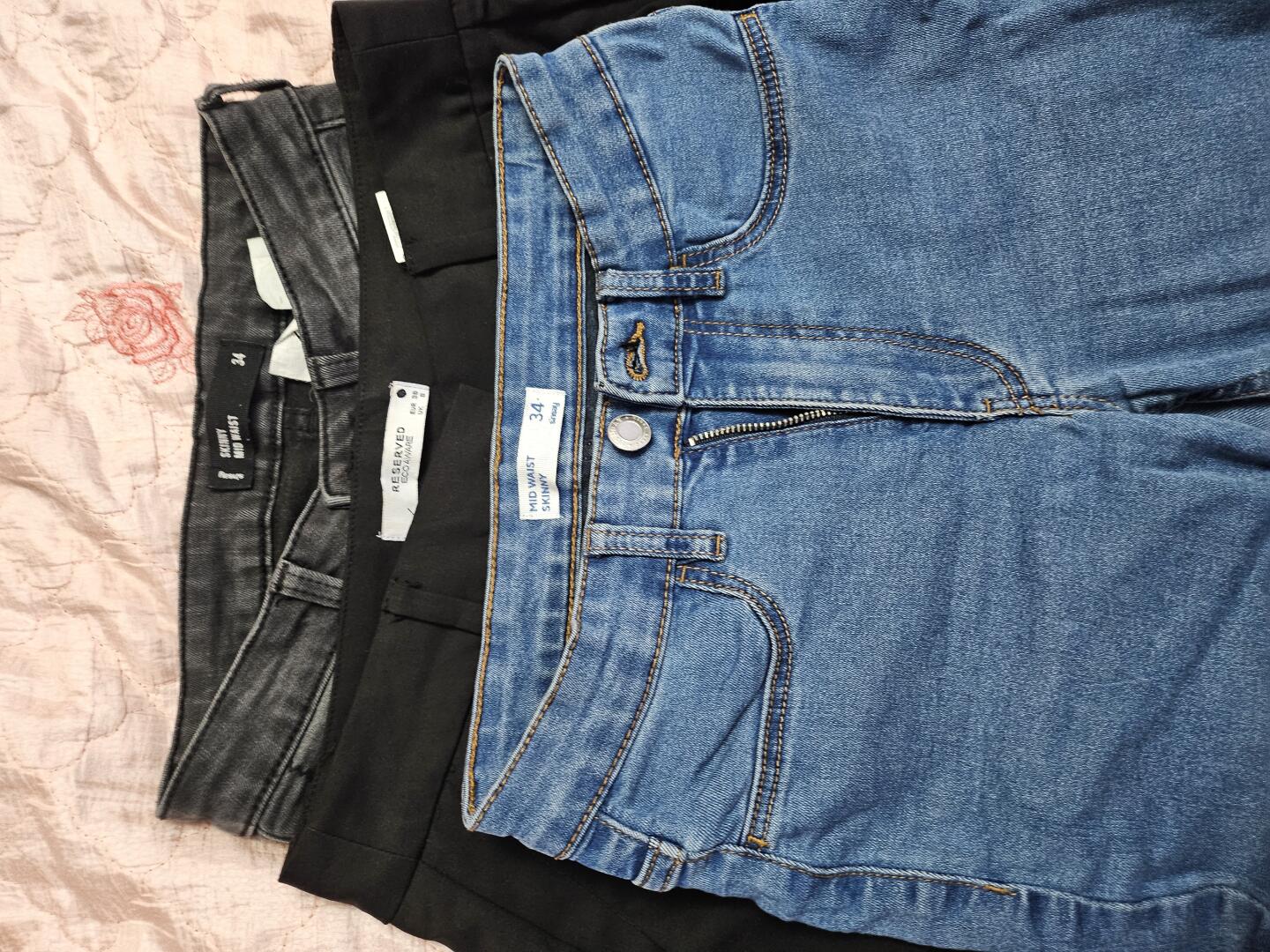 Jedna sztuka to materiałowe spodnie czarne eleganckie, reszta to jeansowe spodnie w różnych odcieniach - jasno niebieski jeans, granatowy jeans, czarne, 2 sztuki białe.
